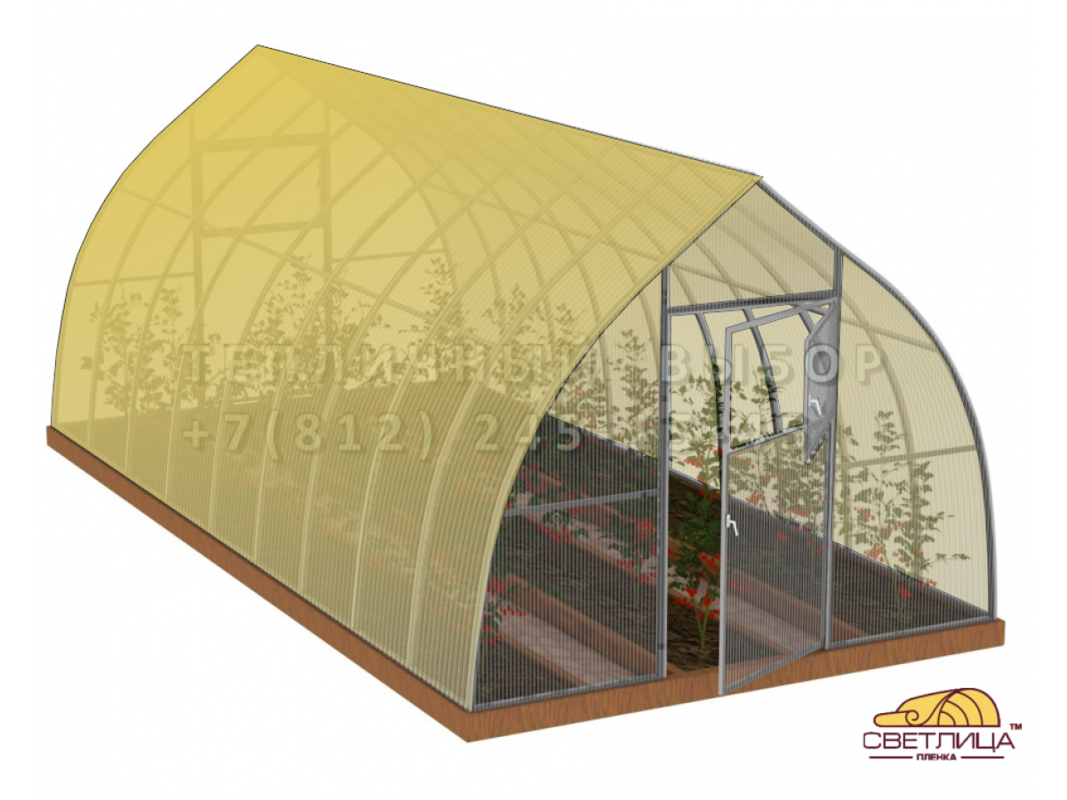 • укрывной материал на крышу теплицы - легендарная пленка «Светлица» толщиной 150 мкм, пленка имеет уникальный состав, который делает ее прочной, эластичной и долговечной (не менее 7 лет без снятия на зиму)